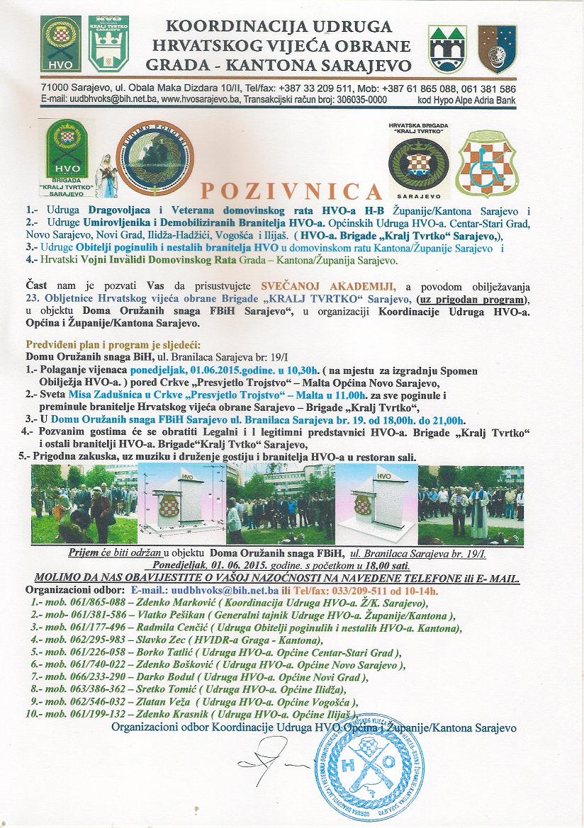 Pozivamo sve da prisustvuju SVEČANOJ AKADEMIJI koja će se održati 01.06.2015. godine povodom obilježavanja 23. Obljetnice Hrvatskog vijeća obrane Brigade „KRALJ TVRTKO“ Sarajevo, (uz prigodan program), u objektu Doma Oružanih snaga FBiH Sarajevo“, u organizaciji Koordinacije Udruga HVO-a. Općina i Županije/Kantona Sarajevo.