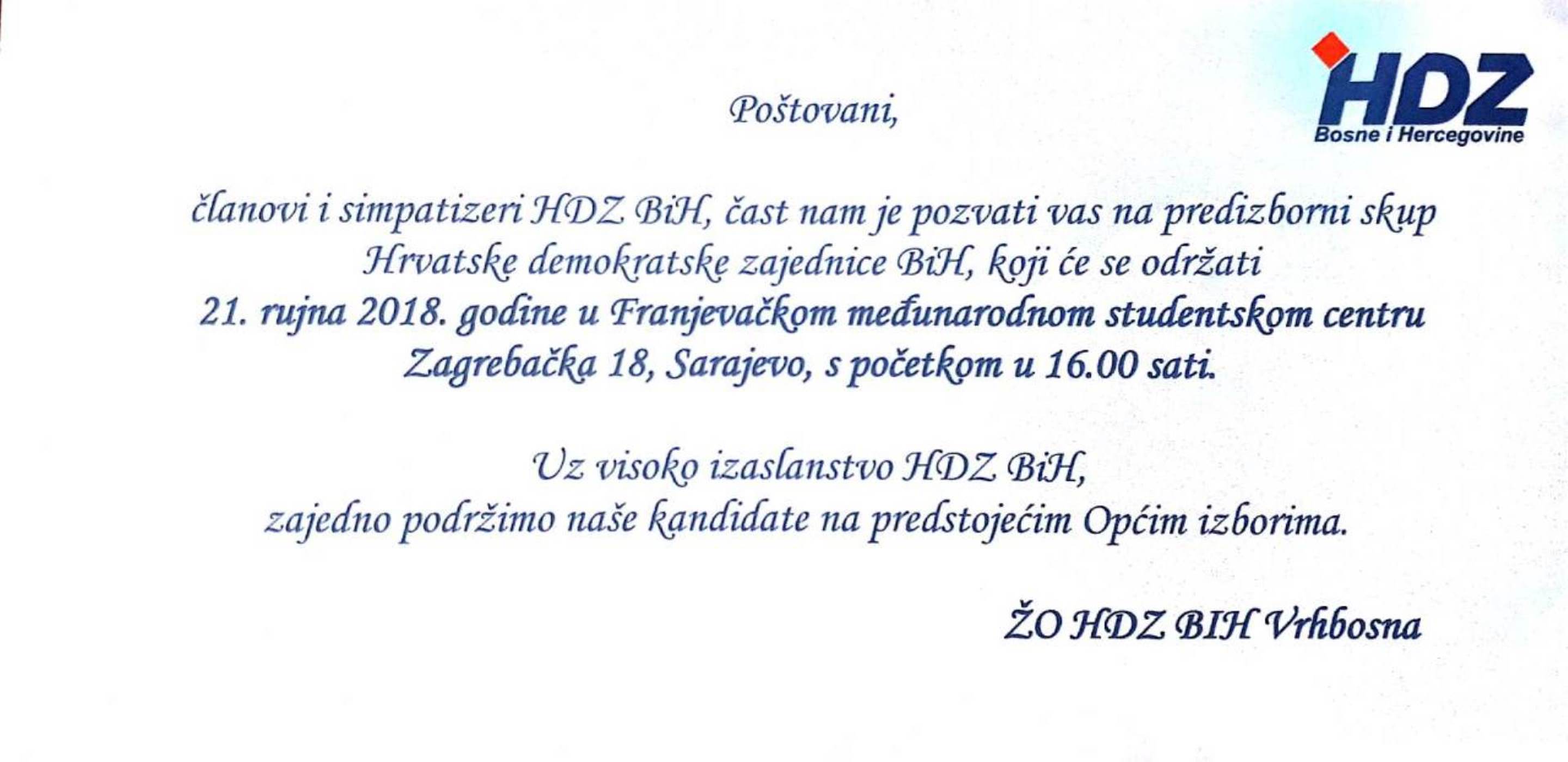 POZIVNICA NA PREDIZBORNI SKUP Predizborni skup će se održati 21.09.2018. godine u Franjevačkom međunarodnom studentskom centru s početkom u 16.00. Očekujemo vaš dolazak i podršku našim kandidatima na Općim izborima.